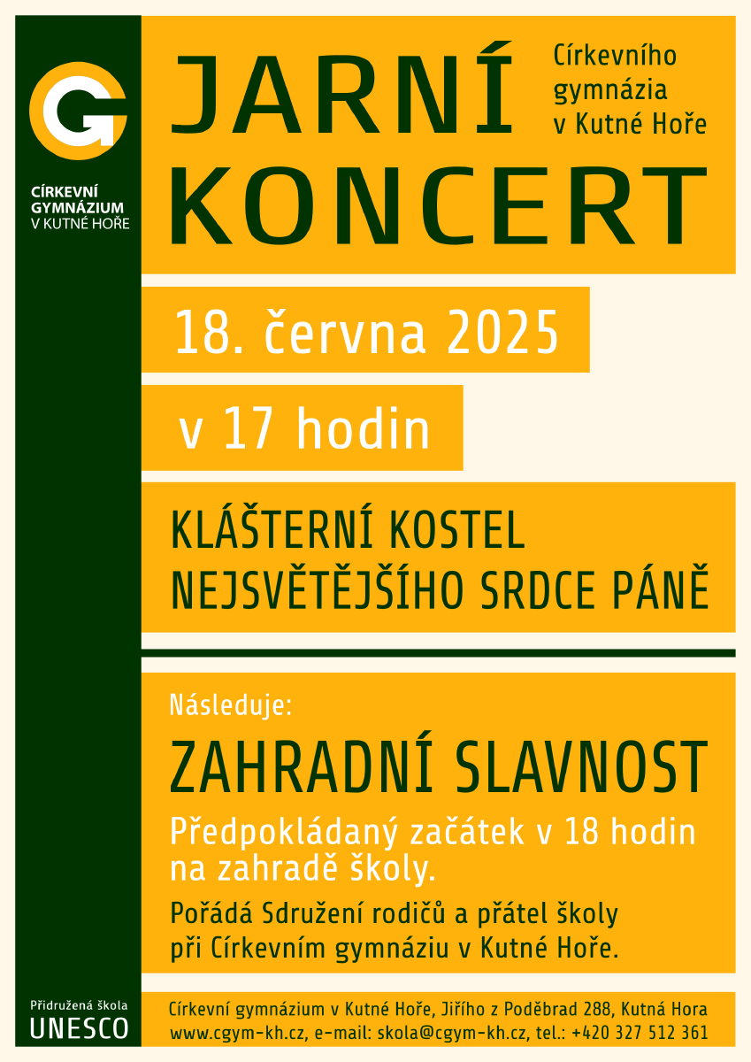 Ve středu 18. června 2025 od 17 hodin se koná v klášterním kostele Jarní koncert Církevního gymnázia v Kutné Hoře. Následovat bude Zahradní slavnost - setkání s rodiči a studenty na školní zahradě, kterou pořádá Sdružení rodičů a přátel školy při Církevním gymnáziu v Kutné Hoře.