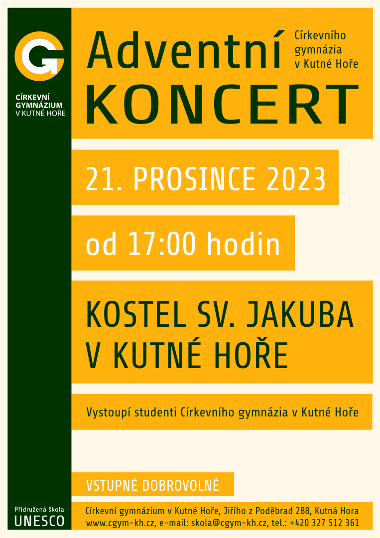 Vážení a milí studenti, zaměstnanci, rodiče a přátelé školy. Zveme Vás na adventní koncert, který se uskuteční 21. 12. 2023 od 17:00 hodin v kostele sv. Jakuba. Těšit se můžete na pestrá hudební vystoupení studentů i učitelů pod taktovkou našich hlavních hudebníků. (Vstupné dobrovolné.)