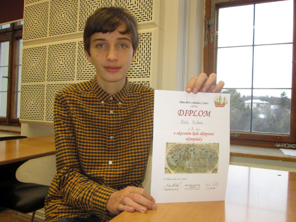 Znalosti z historie i všeobecný přehled využil student kvarty Pavel Kluh v okresním kole dějepisné olympiády (pro tento rok bylo vybráno téma "Za poznáním, za obchodem i za prací aneb Cesty jako tepny civilizace") a získal třetí místo.