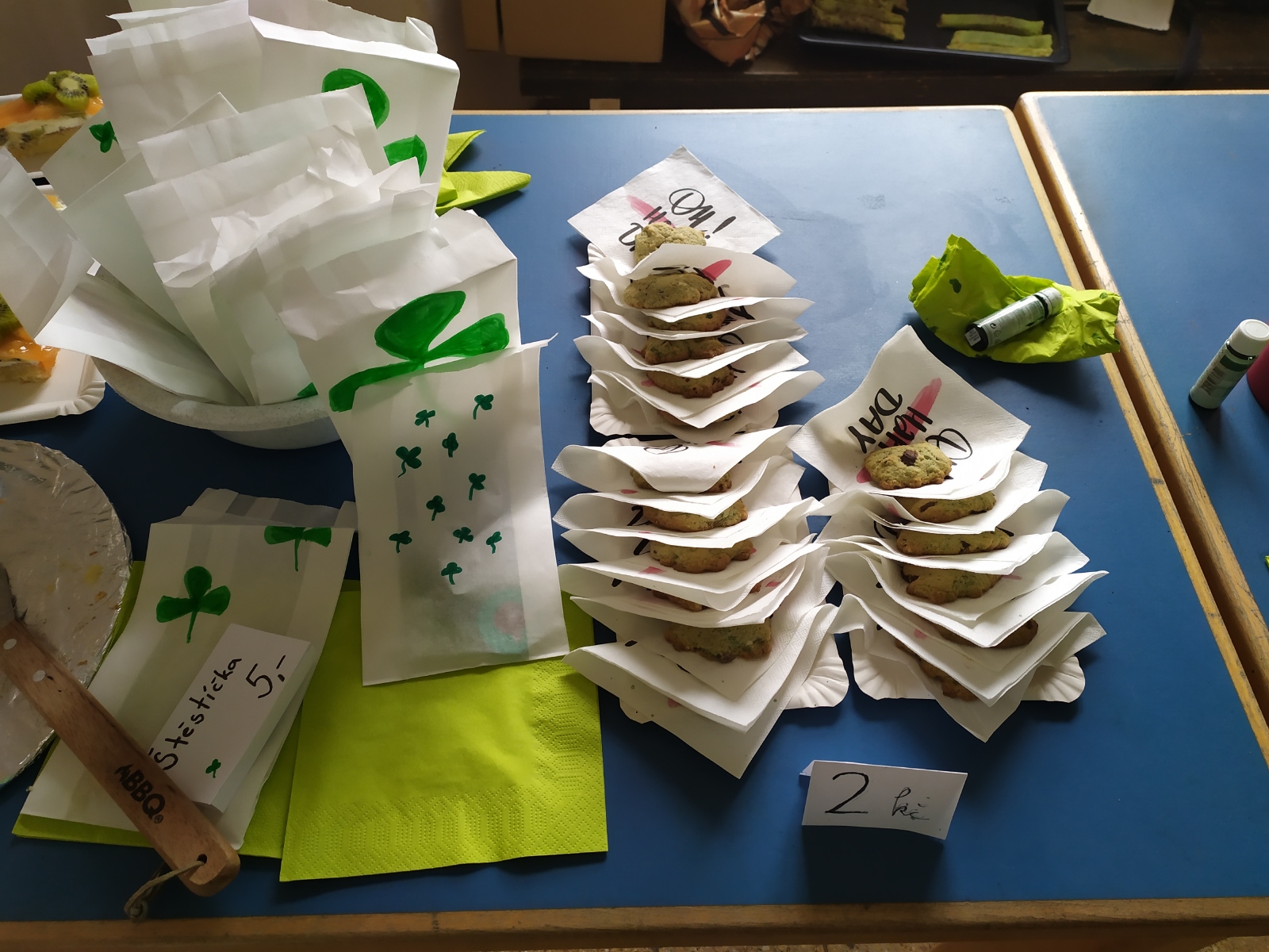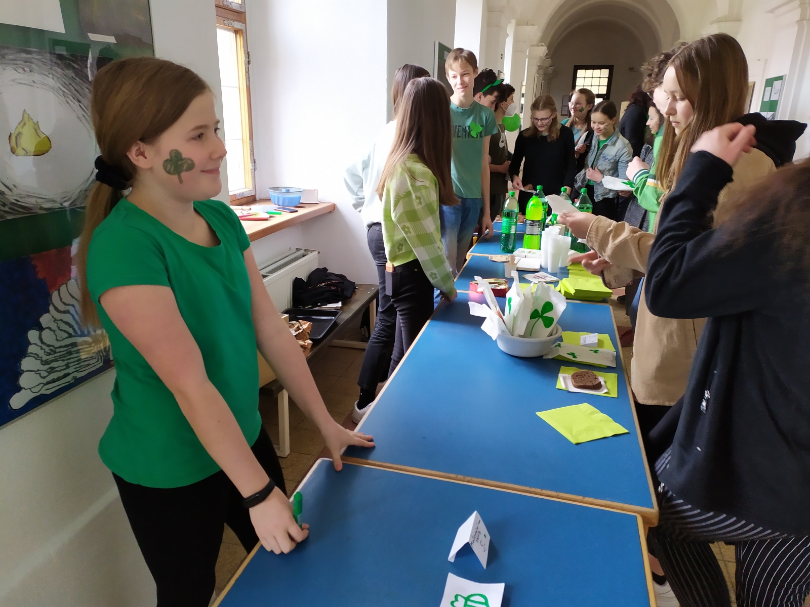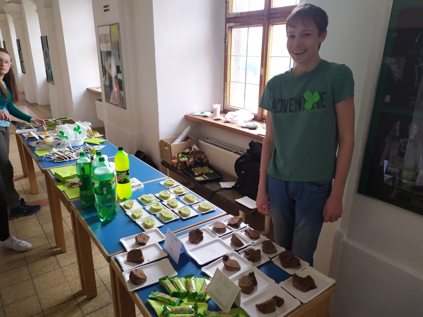 Během první vyučovací hodiny ve čtvrtek chodili někteří terciáni po třídách a říkali ostatním studentům, proč se tento svátek slaví a co jsme si pro ně připravili. Napekli jsme nějaké zelené dobroty a připravili nějaké pití. Také jsme malovali na obličej a prodávali štěstíčka. Původně jsme měli v plánu prodávat první a druhou přestávku, ale téměř vše se vyprodalo hned první přestávku. Tu druhou byla soutěž v nafukování balónků. Výherkyni jsme předali dárkovou tašku se zelenou výhrou.