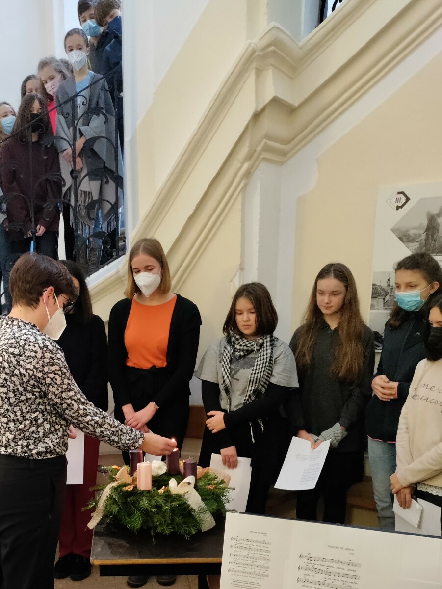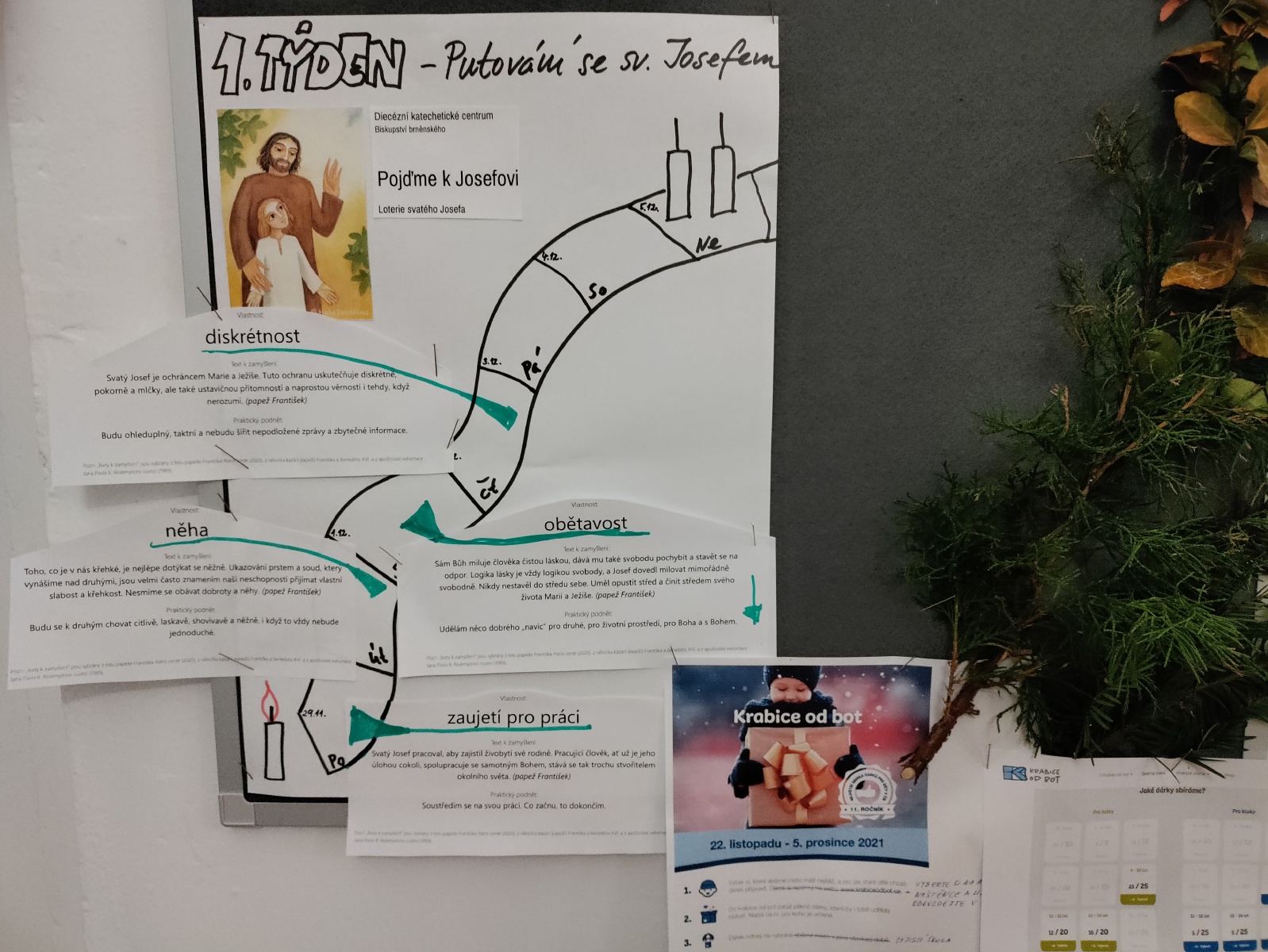 V pondělí 29. listopadu se primáni a sekundáni zúčastnili žehnání advedntního věnce, který za hodebního doprovodu scholy požehnal spirituál školy pater Tobek. Ředitelka školy Z. Šimůnková představila adventní putování, kterým se můžeme připravit na vánoční čas. V prvním týdnu bylo možné následovat svatého Josefa pomocí inspirace jeho vlastnostmi, které jsme na každý den vylosovali v loterii sv. Josefa (připravilo Biskupství brněnské). Komu se povedlo zamyslet se nebo splnit nějakou výzvu, připojil v pátek svojí ozdobu na náš vánoční strom.