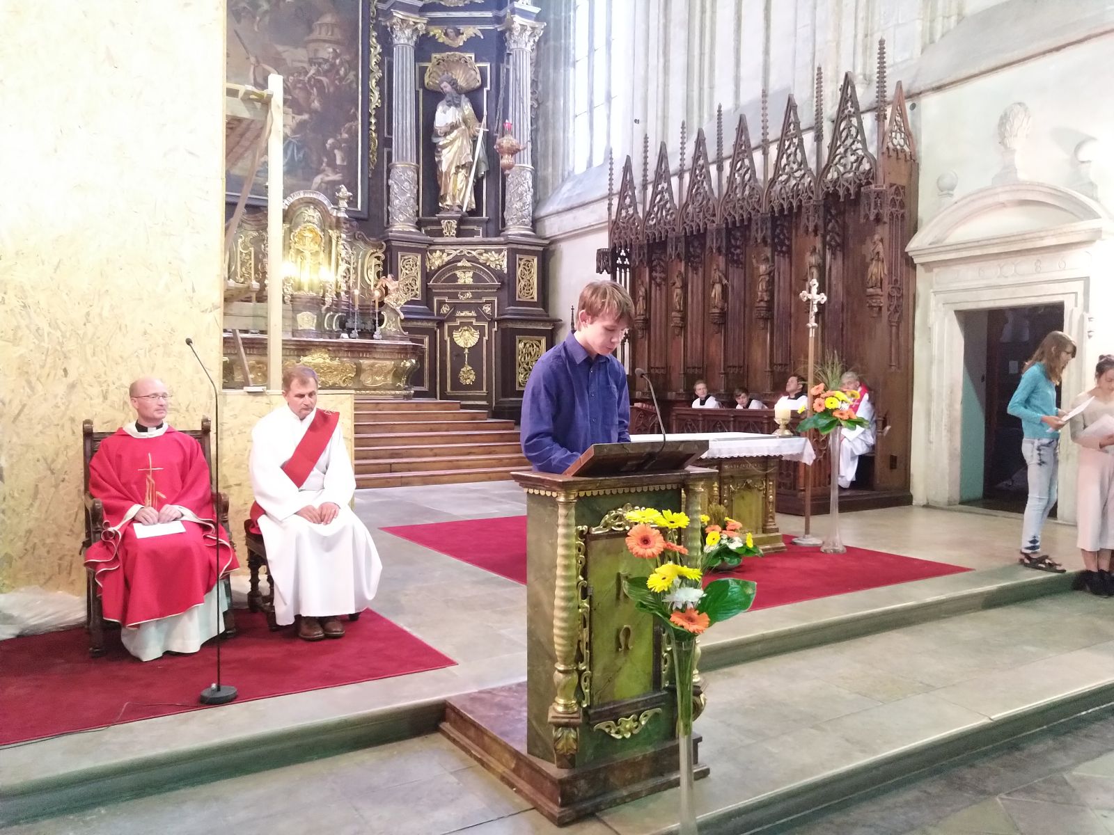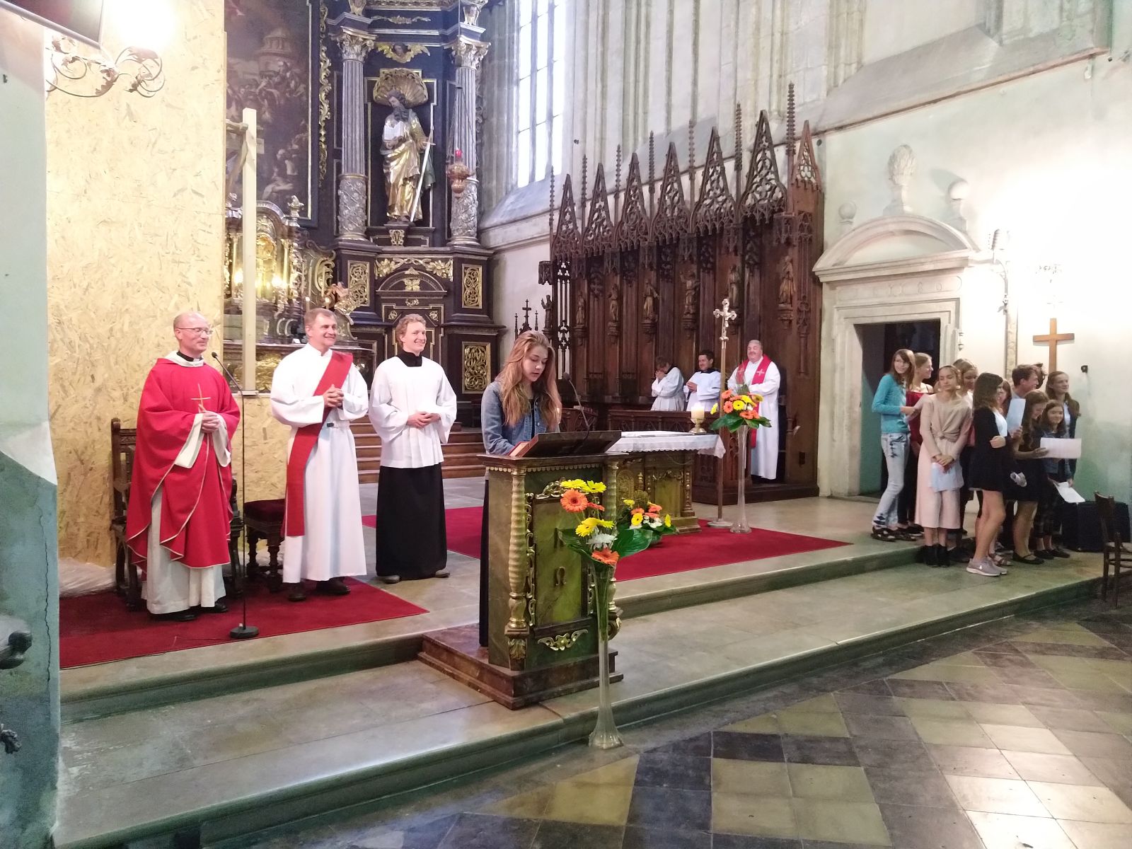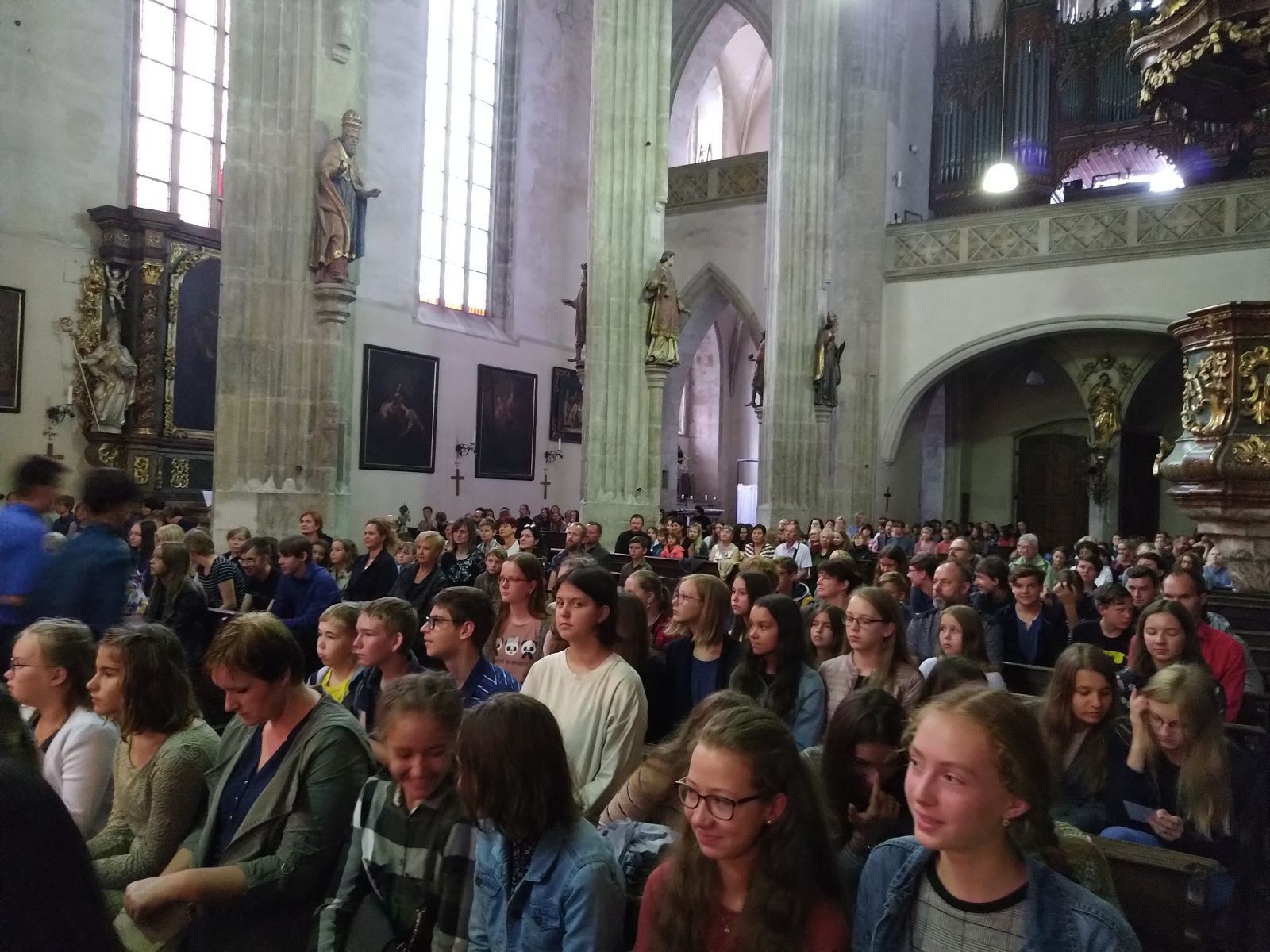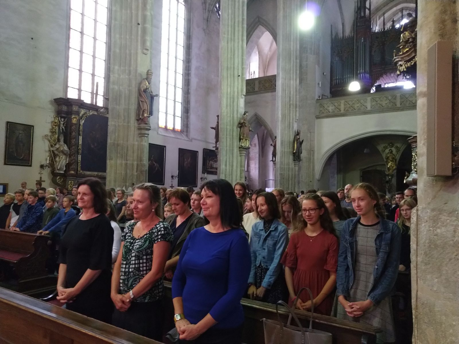 V kostele svatého Jakuba se jako každoročně sešli všichni studenti i učitelé, aby zahájili další školní rok mší svatou. Tu celebroval biskupský vikář pro školství ThLic. Prokop Brož, který byl v letech 1998 - 2001 spirituálem na našem gymnáziu.