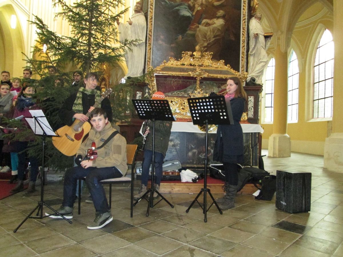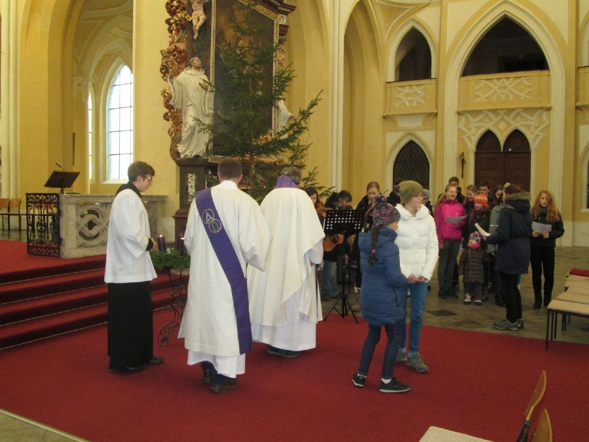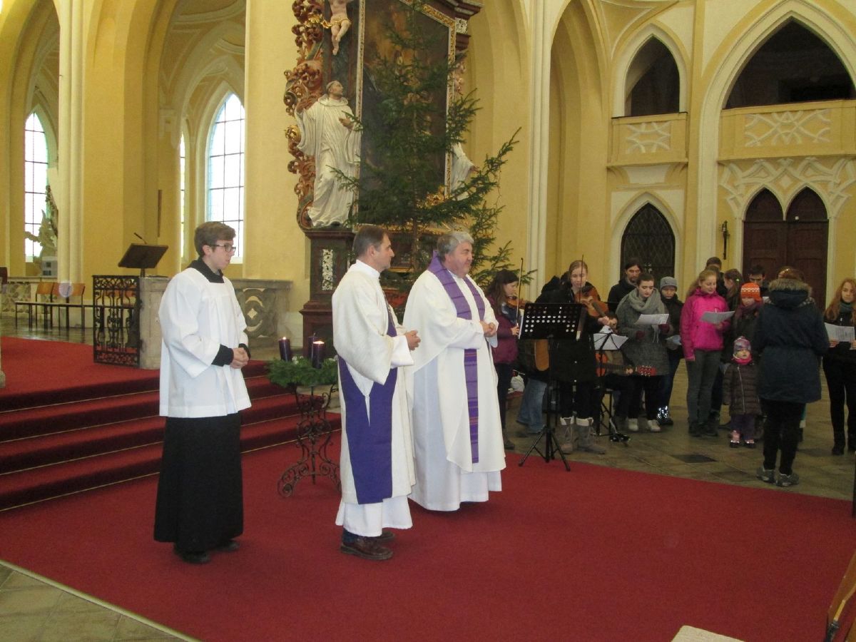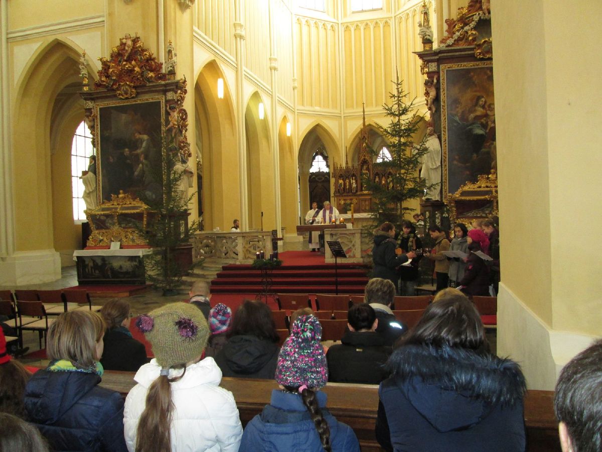 Tradiční předvánoční školní mši, jíž se účastní všichni učitelé, zaměstnanci i studenti školy, celebroval spirituál školy a vikář sedlecké farnosti Pavel Tobek.
